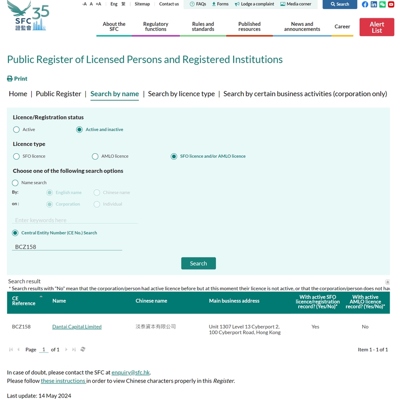 Sequoia Markets Ltdは、香港証券先物委員会(SFC)からライセンス番号BCZ158でライセンスを取得していると主張しています。しかし、SFCの公式ウェブサイトで検索したところ、このライセンス番号はDantai Capital Limitedに属していることがわかります。Sequoia Markets LtdがSFCに登録またはライセンスされている記録はなく、これにより同社の虚偽の主張がさらに明らかになりました。