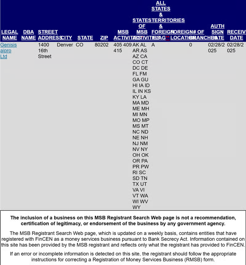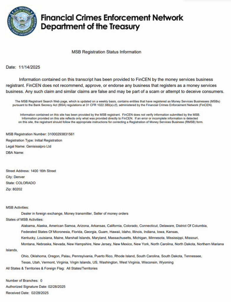 公開情報によると、Genisisaipro Ltdはアメリカ・コロラド州に法人として登録され、さらにアメリカ金融犯罪取締ネットワーク(FinCEN)のMSB(Money Services Business)としても登録されています。MSBの業務範囲には、現金交換、送金、為替、マネーオーダー、プリペイドカード販売などが含まれます。