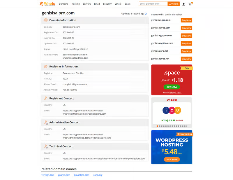 Whois情報によれば、Genisisの公式サイトドメイン「genisisaipro.com」は、登録日が2025年2月26日で、最終更新日も同日となっています。つまり、このドメインはごく最近取得されたばかりであり、ウェブサイトとしての運営履歴も極めて短い初期段階にあります。