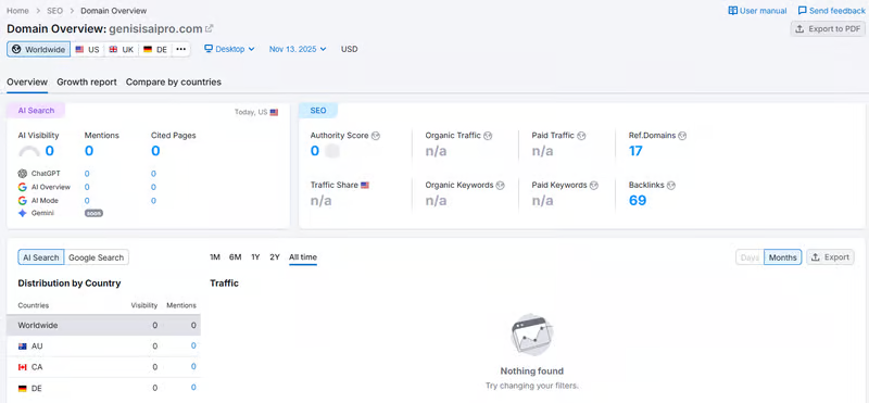 Semrushのデータでは、genisisaipro.comの評価スコアは「0」、自然検索・有料トラフィックともに実質ゼロ、キーワード順位もアクセス記録もほとんど確認できません。参照ドメインは17件、バックリンクは69件あるものの、検索エンジン上での露出はほぼ皆無に近い状態です。