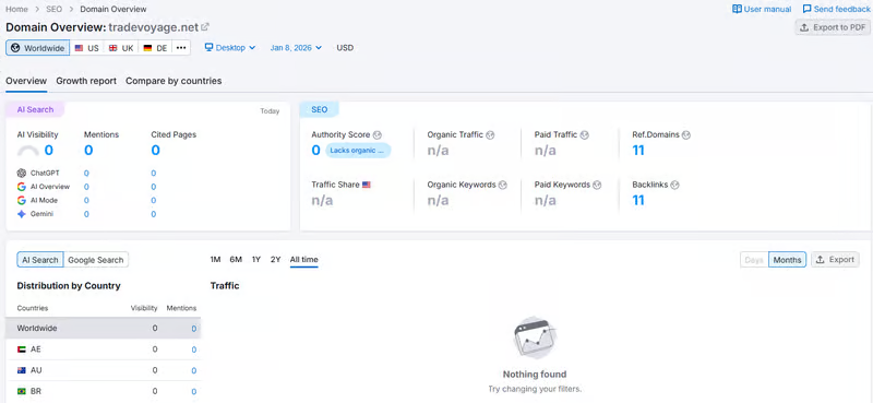 第三者トラフィック指標(Semrush)では、Trade Voyageの月間訪問は大きくないとされ、公開上の認知度や利用規模は限定的と見られます。ドメイン登録の新しさと合わせると、まだアクセスの定着が進んでいない段階である可能性があります。