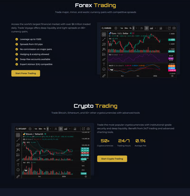 Trade Voyageのサイト上では、複数口座タイプや手数料モデルの説明が確認されていません。最低入金額、レバレッジ、スプレッド、取引手数料などの基本条件も公開されていないため、ユーザーはサービスの実コストを事前に比較しづらい状況です。