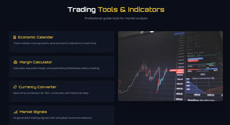 証拠金や損益を概算する計算機能、通貨換算ツールなどが表示され、取引前の確認を補助する意図が見えます。ただし、実際の口座条件が公開されていない場合、試算結果の前提が定まらず、実務上の精度を判断しにくい面があります。